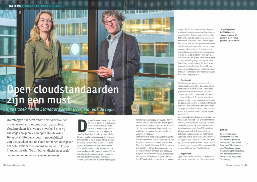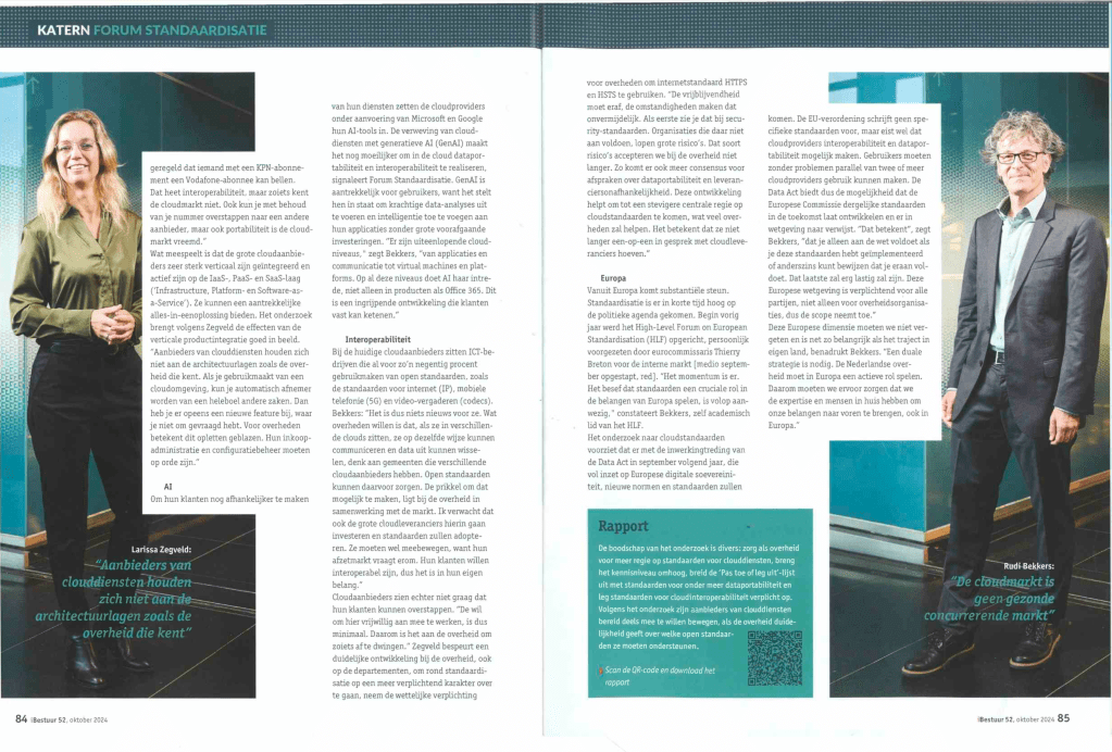 /On 24 October 2024, iBestuur, a journal frequently read by government officials, published an interview of Larissa Zegveld and myself about the need for standards for cloud computing https://ibestuur.nl/artikel/open-cloudstandaarden-zijn-een-must/.